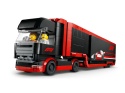 Ciężarówka z lawetą premium ma odczepianą, nisko zawieszoną przyczepę z symulatorem F1 i podwójną komorą na pojazdy oraz całkowicie otwieranymi panelami bocznymi. Dzieci mogą podnieść tylną klapę i wysunąć najazdy, aby załadować fajne bolidy F1 RB20 i AMR24. Zestaw zawiera również minifigurki dwóch kierowców i trzech członków zespołu, a także puchar do odgrywania epickich historii na torze.